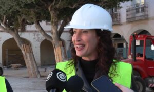 Ya ha comenzado la instalación del nuevo pavimento piedra natural de Almería, que reproduce un mosaico con el Sol de Portocarrero.